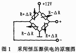 MPX2100是一種壓阻式壓力傳感器,在硅基片上用擴散工藝制成4個電阻阻值相等的應變元件構成惠斯頓電橋。電橋有恒壓源供電和恒流源供電兩種供電方式。采用恒壓源供電的原理圖如圖1所示。