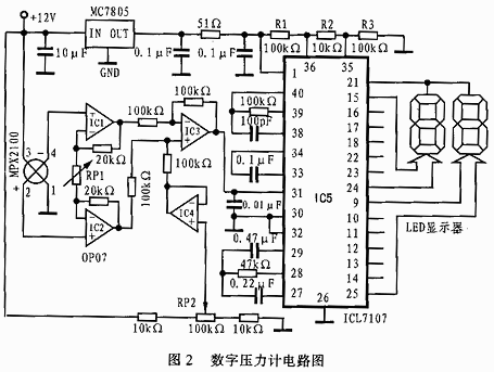 MPX2100構成的數字壓力計如圖2所示。MPX2100的工作電壓為12V,傳感器4腳和2腳之間輸出的壓力信號送到IC1、IC2進行放大,放大器的增益為1+40/RP1,IC1、IC2接成同相輸入阻態(tài),可以獲得儀器放大器所需的高輸入阻抗;IC3是一個單位增益的差動放大器,通過它可以獲得較高的CMRR,IC4和RP2分壓電路構成調零電路,RP1用來調節(jié)放大器電路的增益,以完成滿量程壓力時的顯示數字校準。IC3輸出的電壓加在A/D轉換器IC5的模擬電壓輸入端(31腳),并由IC5轉換成數字量以驅動LED顯示器顯示壓力的大小。