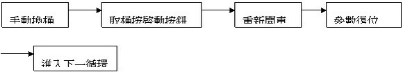 滿桶后,圈條盤出口自動定位,主機停車,依次換桶電機啟動帶動弧形推桶板推出滿桶、斷條、推桶板退回;轉臂電機啟動使轉臂向下旋轉90°;推動電機再啟動,通過轉臂將滿桶繼續(xù)外推;補桶電機通過傳動由撥盤將空桶送至預定位置,撥盤退回;推動電機經轉臂將空桶拉到底盤上;轉臂電機使轉臂上旋90°,最后主電機啟動。完成全部換桶過程只需30多秒。該過程由PLC控制,保證了換桶的可靠性。