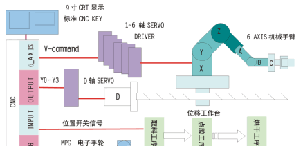 數(shù)控系統(tǒng)選用中達(dá)六軸數(shù)控系統(tǒng),它是機(jī)械手臂的控制中心,除具有線性插補(bǔ)等運(yùn)動控制外,還能夠進(jìn)行畫面顯示、參數(shù)設(shè)定、程序編輯、PLC邏輯控制等。