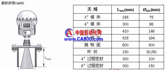 為了使微波能夠不受干擾地傳播,液位計(jì)管嘴的尺寸應(yīng)保持在針對(duì)不同天線所規(guī)定的極限值內(nèi)(見(jiàn)圖3、表2)。