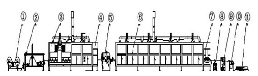 一、引 言 浸漬機(jī)主要用于傢俱板三聚氰胺貼面紙、防火板牛皮紙、面紙、覆銅板絕緣紙、強(qiáng)化木地板耐磨紙以及平衡紙等的生產(chǎn)與加工,根據(jù)生產(chǎn)工藝分為一次浸漬機(jī)與二次浸漬機(jī)兩種。本文以南通四通公司生產(chǎn)的ST-B型臥式二次浸漬機(jī)生產(chǎn)線(xiàn)為例,說(shuō)明其主要工作原理及康沃變頻器在浸漬機(jī)生產(chǎn)線(xiàn)中的應(yīng)用。 二、浸漬機(jī)工作原理 浸漬機(jī)主要由開(kāi)卷機(jī)、浸漬上膠、干燥、牽引、切紙、堆紙升降臺(tái)等部分構(gòu)成,其結(jié)構(gòu)示意如圖1所示。