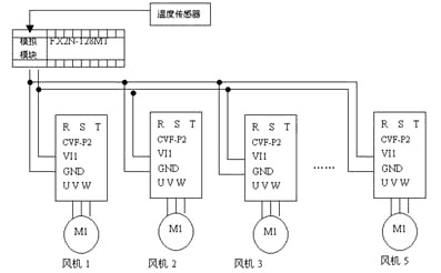 ![]() 切刀變頻器的起動(dòng)與停止信號(hào)由PLC直接給出,通過(guò)外部信號(hào)起動(dòng),其中切刀變頻器加減時(shí)間和直流制動(dòng)有關(guān)參數(shù)可根據(jù)切刀實(shí)際位置進(jìn)行調(diào)整。 3.3烘箱溫度控制 原料紙上膠后進(jìn)入烘箱干燥,烘箱采用熱煤油加熱,由風(fēng)機(jī)進(jìn)行冷卻。每個(gè)烘箱分成5段,風(fēng)機(jī)變頻器控制部份(兩個(gè)烘箱控制相同)如圖5所示。