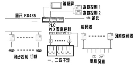 圖1 浸漬機(jī)結(jié)構(gòu)示意圖 1.開(kāi)卷機(jī) 2.一次浸漬擠膠 3.一次干燥段 4.一次排濕 5. 二次覆涂 6. 二次干燥段 7.二次排濕 8.調(diào)偏機(jī) 9.牽引機(jī) 10.切紙機(jī) 11.堆紙升降臺(tái) 2.1主要工藝流程 原筒紙從開(kāi)卷機(jī)經(jīng)進(jìn)紙輥傳入背涂輥進(jìn)行背涂,通過(guò)一次浸膠、擠膠、抹平后進(jìn)入一次烘箱段干燥、冷卻,經(jīng)一次糾編后由二次覆涂機(jī)進(jìn)行正反兩面覆涂及二次抹平,接著進(jìn)入二次烘箱段進(jìn)行干燥,經(jīng)冷卻后紙張經(jīng)調(diào)偏機(jī)的檢測(cè)機(jī)構(gòu),對(duì)紙張的偏移進(jìn)行自動(dòng)糾偏,在牽引輥筒的牽引、冷卻作用下進(jìn)入切紙機(jī)進(jìn)行高精度切紙,最后由升降臺(tái)進(jìn)行堆垛。 2.2主要技術(shù)參數(shù): 以南通四通公司生產(chǎn)的ST2700B臥式二次浸漬機(jī)為例,主要工藝參數(shù)如下: 工作幅寬: 2440mm 機(jī)械速度: 0-60m/min 上 膠 量: 60-270% 揮發(fā)含量: 6-7.5% 熱 源: 飽和蒸汽/導(dǎo)熱油 導(dǎo)熱油入口溫度: 大于200℃ 裝機(jī)容量: 82Kw(ST1500B四呎) 浸漬材料: 高、低壓三聚氰胺樹(shù)脂、脲醛樹(shù)脂、酚醛樹(shù)脂 加工產(chǎn)品: 耐磨紙、裝飾紙、水泥模板紙、絕緣紙 2.3浸漬機(jī)的電氣控制 該浸漬機(jī)生產(chǎn)線(xiàn)采用人機(jī)界面+PLC+變頻器方式,實(shí)現(xiàn)單動(dòng)與聯(lián)動(dòng)控制(見(jiàn)圖2)。