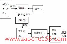 曲軸位置信號(hào)(CPS)是PCM控制點(diǎn)火系統(tǒng)中最主要的傳感器信號(hào),為適應(yīng)多種PCM的需求,設(shè)計(jì)采用CPLD和DA的方式產(chǎn)生。CPS信號(hào)產(chǎn)生原理如圖5所示,在EPROM中存有一個(gè)周期的正弦表數(shù)據(jù),當(dāng)需要產(chǎn)生CPS信號(hào)時(shí),ARM單片機(jī)對(duì)CPLD進(jìn)行設(shè)置,CPLD根據(jù)接收的控制命令,通過時(shí)鐘計(jì)數(shù),產(chǎn)生讀存儲(chǔ)器的信號(hào),并向EPROM提供合適的地址信號(hào)和控制信號(hào),EPROM輸出相應(yīng)地址的數(shù)據(jù),經(jīng)D/A轉(zhuǎn)換,變成單端CPS模擬信號(hào),然后經(jīng)濾波電路和單端轉(zhuǎn)差分處理電路,輸出CPS差分信號(hào)。在實(shí)際的電路實(shí)現(xiàn)中,對(duì)CPS信號(hào)的控制可由計(jì)算機(jī)通過CAN總線向ARM發(fā)出控制命令進(jìn)行設(shè)置,因此,即使ARM芯片在運(yùn)行過程中復(fù)位,電路仍能輸出正確的CPS信號(hào),以確保測(cè)試周期的正常進(jìn)行。