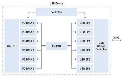 根據(jù)USB協(xié)議,USB終端是獨(dú)立進(jìn)行工作的,所以在設(shè)備上實(shí)現(xiàn)的DMA映射,實(shí)際上就是在USB 總線上為設(shè)備上的6條高速信號(hào)通道提供不同的數(shù) 據(jù)采集功能。利用這項(xiàng)技術(shù)的設(shè)備,諸如NI公司M系列多功能USB數(shù)據(jù)采集設(shè)備,可以在USB總線上獲得高達(dá)16MS/s的吞吐量。