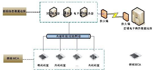 下面的示意圖是研祥終端MCA在一個大型醫(yī)院的各種信息系統(tǒng)及EHR、EMR的應(yīng)用方案: