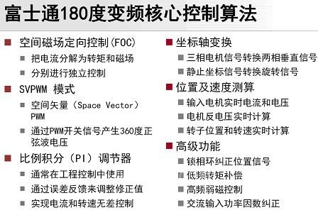 算法可為變頻方案競爭的重中之重。富士通180度變頻核心控制算法包括上圖所示的這些重要組成部分,可從以往的專用內(nèi)核MCU平臺快速移植到FM3 通用32位MCU平臺上,從而將幫助加速180度直流變頻的普及,為家電和工業(yè)設(shè)備的節(jié)能降耗作貢獻(xiàn)。