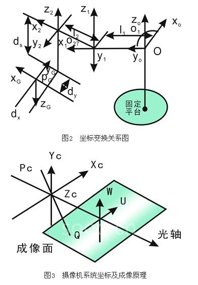 本文擬對系統(tǒng)進(jìn)行實(shí)驗(yàn)研究。建立機(jī)器人坐標(biāo)、攝像機(jī)坐標(biāo)、圖像坐標(biāo)和目標(biāo)點(diǎn)坐標(biāo)的坐標(biāo)變換關(guān)系。圖2是在機(jī)器人的第二根桿末端安裝一個(gè)攝像頭,形成eye-in-hand構(gòu)型而建立的坐標(biāo)變換關(guān)系圖。圖3是攝像機(jī)系統(tǒng)坐標(biāo)與圖像坐標(biāo)的關(guān)系及成像原理示意圖。