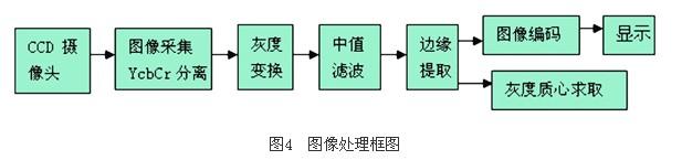由ccd攝像頭攝取的按4:2:2格式傳輸?shù)牟噬M視頻信號經(jīng)過解碼芯片的采集,對y、cb、cr信號按照2:1:1采樣率進(jìn)行采樣,并將它們分離開來。在dsp系統(tǒng)中將彩色圖像轉(zhuǎn)變成灰度圖像,對該圖像進(jìn)行閾值二值化后變成二值圖像,然后經(jīng)過中值濾波濾除噪聲點(diǎn),使用sobel算子進(jìn)行邊界提取。對該邊界圖像信號使用點(diǎn)hough質(zhì)心求取算法求取質(zhì)心圖像坐標(biāo)[3],并通過串口通訊將質(zhì)心坐標(biāo)值傳遞給工控機(jī)程序;同時(shí),處理后的數(shù)字視頻信號經(jīng)過編碼芯片編碼后,送顯示設(shè)備實(shí)時(shí)顯示。