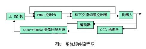 本實(shí)驗(yàn)系統(tǒng)由工控機(jī)、pmac運(yùn)動(dòng)控制卡、松下交流伺服系統(tǒng)、dsp圖像處理系統(tǒng)和機(jī)器人組成。了解和熟悉松下交流伺服系統(tǒng)的原理和功能后,調(diào)試機(jī)器人關(guān)節(jié)伺服電機(jī)的運(yùn)行,優(yōu)化相關(guān)控制參數(shù)以求獲得最好伺服效果;研究pmac運(yùn)動(dòng)控制卡的原理和功能,并與松下交流伺服系統(tǒng)配合,編寫運(yùn)動(dòng)程序,不斷調(diào)整和優(yōu)化pmac卡的控制參數(shù),以求獲得滿意的運(yùn)動(dòng)控制效果;對seed-vpm642圖像處理系統(tǒng)進(jìn)行深入學(xué)習(xí)和研究后,開發(fā)視頻圖像處理程序。組成該系統(tǒng)的硬件流程圖如圖5所示。