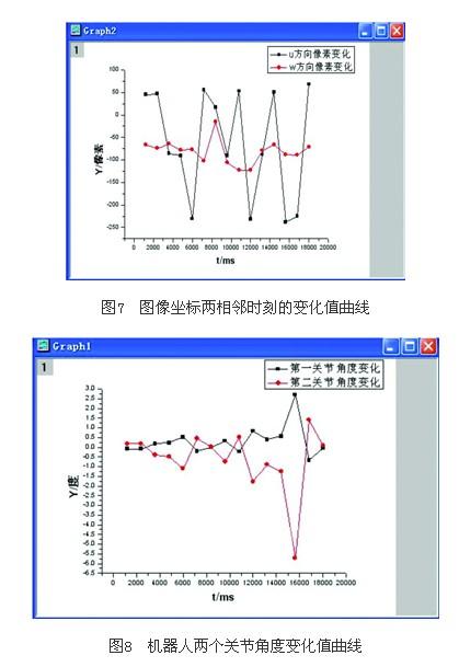根據(jù)以上數(shù)據(jù)運(yùn)用originpro軟件繪制的圖形如下:圖7是圖像坐標(biāo)兩相鄰時(shí)刻的變化值曲線,圖8是機(jī)器人兩個(gè)關(guān)節(jié)角度變化值曲線。
