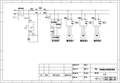 電氣繪圖:根據(jù)要求,選用了3個對射型光電開關(guān)和2個光纖傳感器。用CAD繪出了電氣控制原理圖和PLC接線圖: