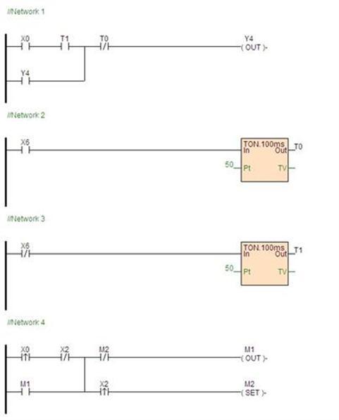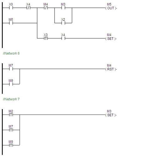 程序編制:根據(jù)設(shè)備工藝要求和電氣原理圖來設(shè)計PLC 程序。海為公司為了用戶更好的應(yīng)用PLC,還是做了大量的程序示例。海為的編輯軟件用著也挺好用,一下子就習(xí)慣了(附部分程序)。