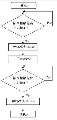 2)反滲透裝置自動(dòng)停機(jī),停機(jī)低壓沖洗:濃水箱液位低于設(shè)定值時(shí)(暫定0.3m),執(zhí)行停機(jī)程序。先停止高壓泵、增壓泵,再打開沖洗進(jìn)水閥、濃水排放閥,啟動(dòng)沖洗泵進(jìn)行低壓沖洗,沖洗15分鐘后,先關(guān)閉濃水排放閥,再關(guān)閉沖洗進(jìn)水閥,關(guān)閉沖洗水泵進(jìn)入待機(jī)狀態(tài)。