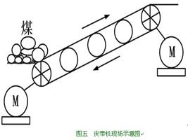 與提升機(jī)的用途基本同理,皮帶機(jī)也是從井下運(yùn)送煤到地面。區(qū)別在于皮帶機(jī)的功率更大,它的啟動(dòng)和運(yùn)行方式為繞線電機(jī)經(jīng)轉(zhuǎn)子繞組降壓?jiǎn)?dòng)后工頻運(yùn)行,經(jīng)液力耦合器切換至皮帶機(jī)。圖四是煤層工作原理,圖五是皮帶機(jī)現(xiàn)場(chǎng)示意圖。