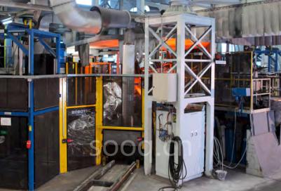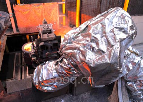 B通過使用兩個可以澆鑄液態(tài)鐵的 KUKA KR 1000 titan 重載機(jī)器人,Georg Fischer 可獲得最大的靈活性,并使砂箱型面得到最佳利用?,F(xiàn)在澆鑄系統(tǒng)不再規(guī)定允許鑄造件位于何處。在由集成商 ROBOTEC Engineering 有限公司開發(fā)的解決方案中,兩個 KR 1000 titan 可以并行工作。另外,耐熱外罩還可防止機(jī)器人由于鑄造廠內(nèi)極高的環(huán)境溫度而受到損壞。在機(jī)器人法蘭處有一個注滿 1400 度高溫液態(tài)鐵的澆注槽。另外,在澆注槽與機(jī)器人法蘭之間安裝了一個可以測量液態(tài)鐵量的稱重傳感器。這樣在下一次澆注循環(huán)時可以精確地計量所缺的液態(tài)鐵的量。澆注槽內(nèi)的液態(tài)鐵始終保持最佳用量。通過六軸機(jī)器人的靈活性,液態(tài)鐵可在砂箱的任意位置澆注。砂模冷卻至 700 度以下,直至可以將鑄造件取出。在繼續(xù)冷卻至室溫后,必須對部件進(jìn)行噴射并在準(zhǔn)備交付之前執(zhí)行目檢。在出現(xiàn)故障或長時間停機(jī)時,澆注槽內(nèi)的金屬會冷卻而無法再用于澆注。ROBOTEC 專門針對這種情況研發(fā)了一個創(chuàng)新的解決方案:過程中的鐵可以通過兩個機(jī)器人重新放入鑄造爐,使其重新回溫。