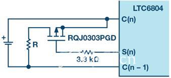 LTC6804 具有內(nèi)部被動(dòng)均衡功能 (圖 3);如果需要,它還可以配置外部 MOSFET(圖 4)。它還具有可選的可編程被動(dòng)均衡放電計(jì)時(shí)器,可為用戶提供更多的系統(tǒng)配置靈活性。