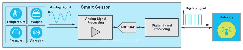 圖2.從簡(jiǎn)單的模擬傳感器轉(zhuǎn)向智能傳感器。智能模擬傳感器包括整個(gè)信號(hào)鏈和處理單元。