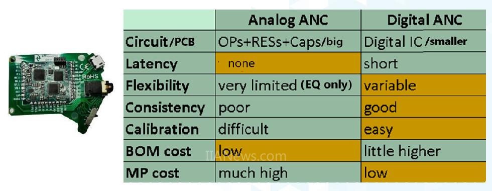 據(jù)Sophie Mao介紹,主動(dòng)降噪有模擬和數(shù)字兩種噪聲處理電路。盡管模擬電路基本零延時(shí),數(shù)字電路存在延時(shí),但模擬主動(dòng)降噪電路組成元器件多、PCB尺寸大、精度要求高,因而數(shù)字降噪是當(dāng)前的主流。此外,靈活性方面,模擬主動(dòng)降噪方式有限,主要以調(diào)音量為主,而數(shù)字主動(dòng)降噪可以通過(guò)調(diào)節(jié)增益、EQ系數(shù)、更新固件等方式優(yōu)化降噪效果。模擬主動(dòng)降噪電路的一致性很差,需要多次、反復(fù)在硬件上調(diào)整校準(zhǔn);數(shù)字主動(dòng)降噪一致性好,并有相應(yīng)的調(diào)校工具和軟件來(lái)輕松實(shí)現(xiàn)校準(zhǔn)。最后,模擬主動(dòng)降噪的BOM成本看似較低,但不良率、返工率高,整體量產(chǎn)成本其實(shí)比數(shù)字電路更高。因此,模擬主動(dòng)降噪漸成明日黃花,數(shù)字主動(dòng)降噪成為市場(chǎng)主流。