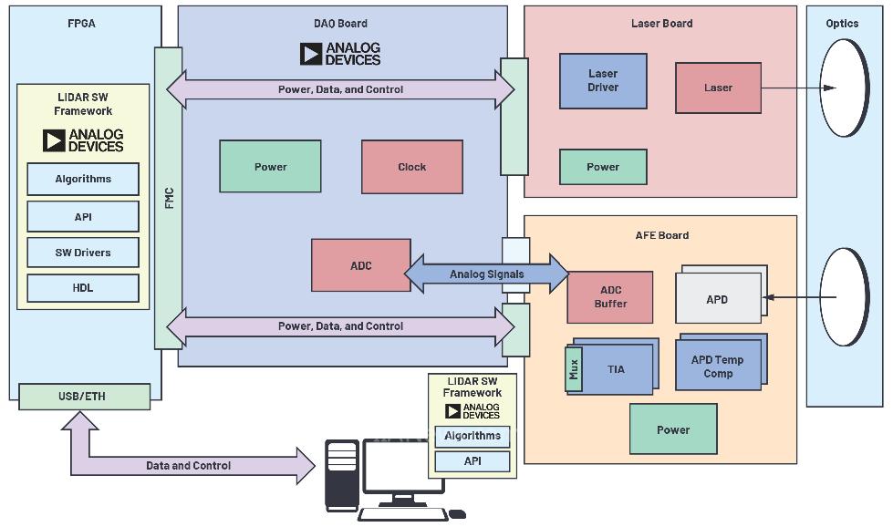 客戶在開發(fā)自己的LIDAR傳感器時,系統(tǒng)設計中會存一些不同之處:接收和發(fā)送光學器件、激光器的數(shù)量和方向、激光發(fā)射模式、激光束控制,以及光接收元件的數(shù)量。但是,不管做出什么選擇,在接收信號鏈和激光器驅動信號要求方面,所有傳感器都高度相似。基于這些假設,ADI公司設計出模塊化LIDAR原型制作平臺AD-FMCLIDAR1-EBZ,以期讓客戶能夠使用他們自己的硬件輕松配置或更換器件;該平臺根據(jù)特定的應用要求設計,但仍可以用作整個系統(tǒng)。該系統(tǒng)可以分為三個不同的電路板,每個都配備標準化的數(shù)字和模擬接口: