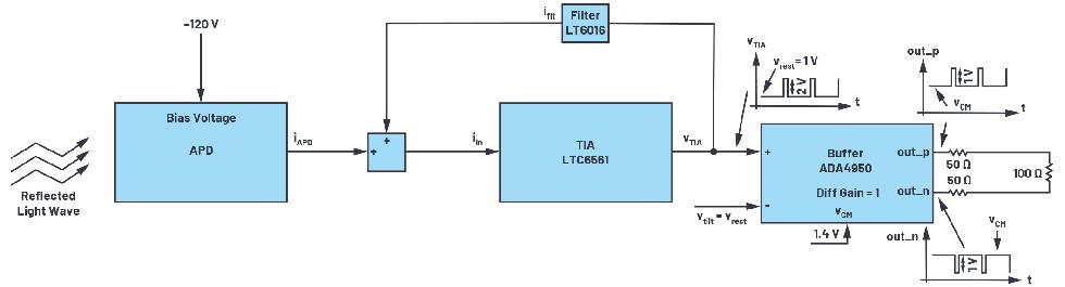 AFE板接收光學反射信號,將其轉化成電子信號,然后傳輸給DAQ板上的ADC。這個板可能是整個設計中靈敏度最高的部分,因為它混合信號調節(jié)電路(使用16通道APD陣列生成的微安電流信號),將光學信號轉化成電子信號,并采用為同樣的APD供電所需的–120 V至–300 V大電壓電源。16個電流輸出被饋送至4個低噪聲四通道互阻增益放大器(TIA)LTC6561,帶有一個內部4合1復用器,用于選擇之后向其中一個ADC輸入端饋送的輸出通道。要特別注意TIA的輸入部分,以實現(xiàn)所需的信號完整度和通道隔離等級,使得APD生成的極低電流信號中不會摻雜更多噪聲,從而最大化系統(tǒng)的SNR和對象檢測率。AFE板的設計顯示,要實現(xiàn)最高信號質量,最好的方法是讓APD和TIA之間的線路長度盡可能短,并在TIA輸入之間增加橢圓孔,以最大化通道間隔離;此外,在部署信號調節(jié)電路時,要保證該電路不會干擾板上的其他電源電路。另一項重要特性是能夠測量APD的溫度,以補償APD信號輸出的變化,這種變化是因為在正常運行期間APD溫度上升導致的。提供幾個旋鈕來控制信號鏈的偏置和APD偏置,這些偏置轉化成APD靈敏度,從而最大化ADC輸入范圍,以實現(xiàn)最大SNR。圖4顯示了AFE板信號鏈的框圖。