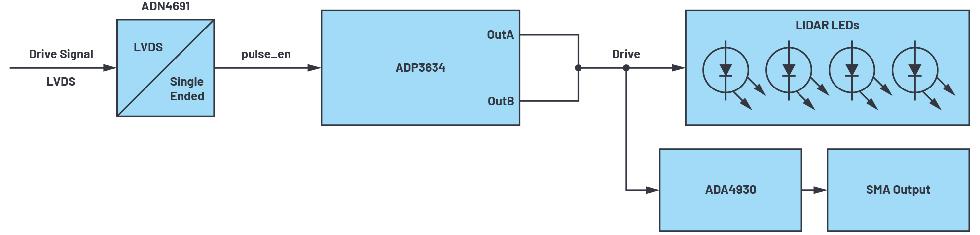 激光器板生成波長為905 nm的光學脈沖。它使用四個激光器,這些激光器同時驅動,以增加光束強度,實現(xiàn)更長的測量距離。此激光器使用由FPGA載波板生成的具備可編程脈寬和頻率的PWM信號來控制。這些信號在FPGA上生成,以LVDS從FPGA傳輸至激光器板,經(jīng)過DAQ板以及連接DAQ和激光器板的扁平電纜期間,不易受到噪聲影響。驅動信號可以返回至其中一個ADC通道,以獲得飛行時間參考。采用外部電源為激光器供電。其設計符合國際標準IEC 60825-1:2014和IEC 60825-1:2007中關于Class 1級激光器產(chǎn)品的要求。