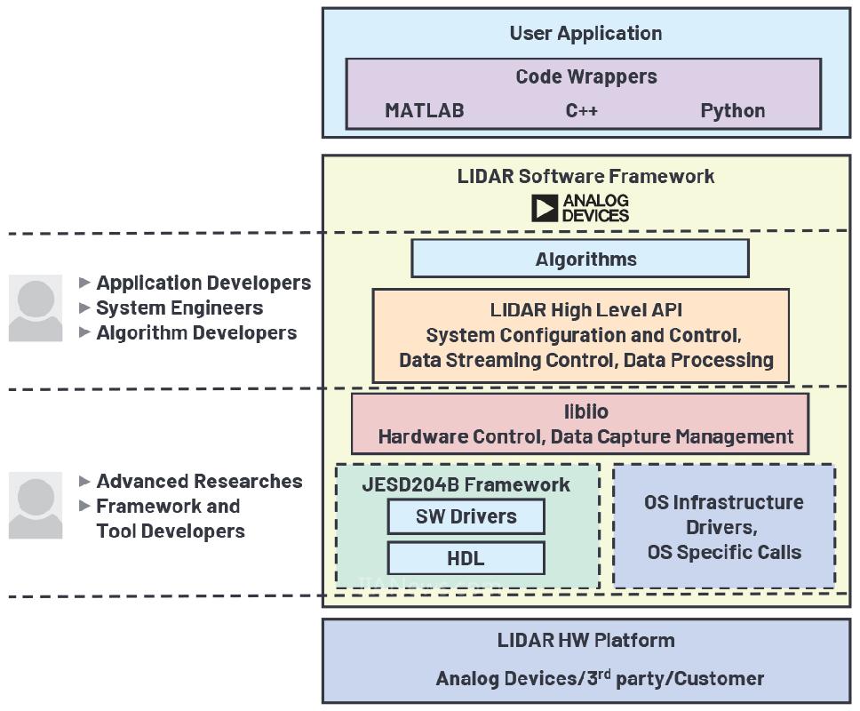 雖然libiio提供低層編程接口,但在大多數(shù)情況下,用戶期望使用平臺相關的集合了低層驅動器調用的API,來展示一組功能,用于訪問和配置各種系統(tǒng)參數(shù)和流數(shù)據(jù)。因此,LIDAR原型制作平臺采用特定的API,以及適用于常用框架和編程語言(例如C/C++、MATLAB?或Python?)的配套組件,6使用戶能夠使用其首選的編程語言與系統(tǒng)連接,集中精力研發(fā)對客戶而言極具價值的算法和應用。