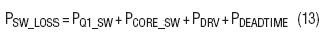 3. 其他交流相關損耗。其他交流相關損耗包括柵極驅動器損耗PSW_GATE(等于VDRV ? QG ? fS)和死區(qū)時間(頂部FET Q1和底部FET Q2均關斷時)體二極管傳導損耗(等于(ΔTON + ΔTOFF) ? VD(Q2) ? fS)。