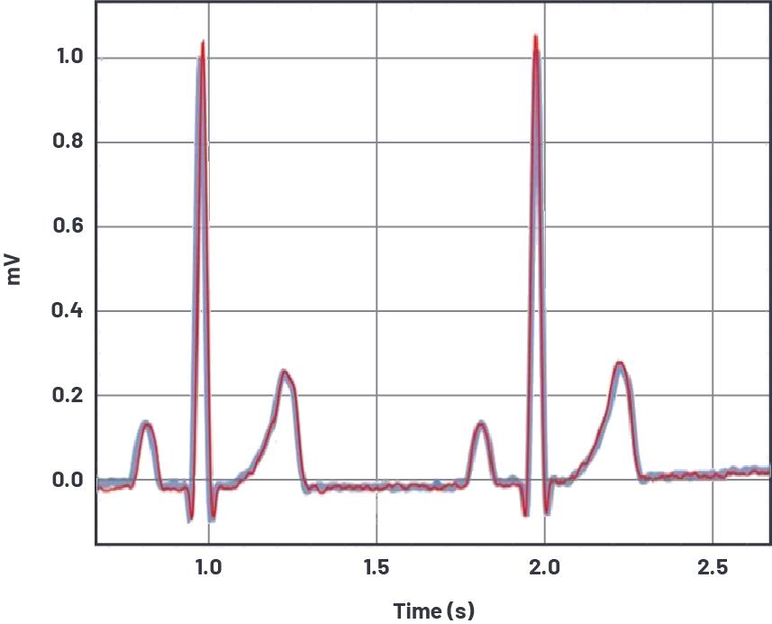 圖4顯示了兩個ECG波形。藍色波形測量結(jié)果采用高質(zhì)量電極,其串聯(lián)阻抗為51 kΩ,電容為47 nF。而紅色波形測量結(jié)果則采用質(zhì)量較差的高串聯(lián)阻抗電極。其接觸阻抗為510 kΩ,電容為4.7 nF。我們可以看到,ADPD4000測得的兩個波形幾乎完全相同,而與電極質(zhì)量無關(guān)。與市場上的替代解決方案相比,這是該前端的巨大優(yōu)勢。另一個優(yōu)勢是該電路具有極高的功效比,因為在充電電容上捕獲ECG信號時不必激活該電路。再一個優(yōu)點是其功耗僅為150 μW至200 μW。