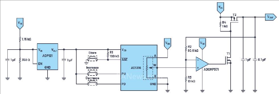 該電路由電壓VIN供電,最高可達(dá)20 V。AD5116和ADCMP371的電源電壓VDD也可由VIN生成,例如,通過ADP121等穩(wěn)壓器。