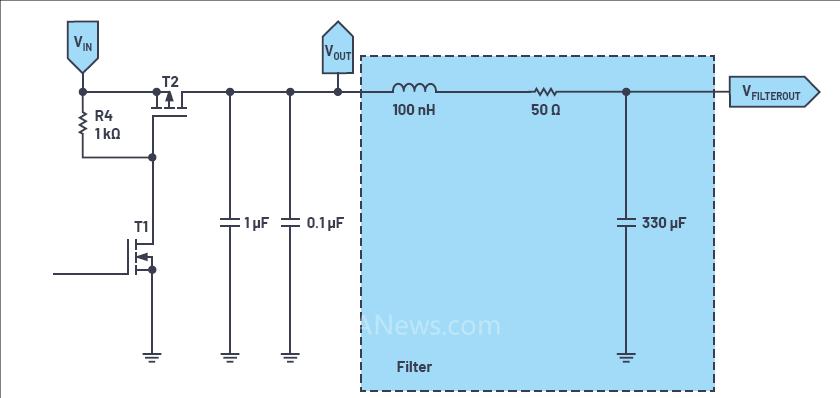 該電路采用了一個(gè)簡單的RLC低通濾波器。R和C分別為50 Ω和330 μF,L為100 nH。該電路在構(gòu)建時(shí),也可以選擇使用脈寬調(diào)制器(PWM)來驅(qū)動(dòng)晶體管和上游的誤差放大器。
