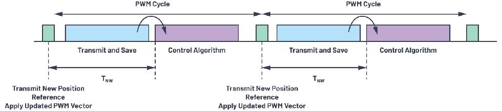 這些應(yīng)用按定義的周期時(shí)間運(yùn)行,這個(gè)時(shí)間一般等于,或者是底層伺服電機(jī)驅(qū)動(dòng)器的基波控制/脈寬調(diào)制(PWM)開關(guān)周期的幾倍。在圖2所示的這種環(huán)境中,端到端網(wǎng)絡(luò)傳輸延遲是一個(gè)重要參數(shù)。在每個(gè)周期內(nèi),電機(jī)控制器必須將新位置基準(zhǔn)和其他相關(guān)信息傳輸給圖1中的各個(gè)節(jié)點(diǎn)。然后,PWM周期內(nèi)需要余留足夠的時(shí)間,以供每個(gè)節(jié)點(diǎn)使用新位置基準(zhǔn)和任何新傳感器數(shù)據(jù)來更新伺服控制算法計(jì)算。然后,各個(gè)節(jié)點(diǎn)通過依賴于工業(yè)以太網(wǎng)協(xié)議的分布式時(shí)鐘機(jī)制,在同一時(shí)間點(diǎn)將更新后的PWM矢量應(yīng)用于伺服驅(qū)動(dòng)器。根據(jù)具體的控制架構(gòu),部分控制回路算法可以在PLC中實(shí)現(xiàn),如果在網(wǎng)絡(luò)上接收到任何相關(guān)傳感器信息更新后,需要足夠的時(shí)間才能實(shí)現(xiàn)。