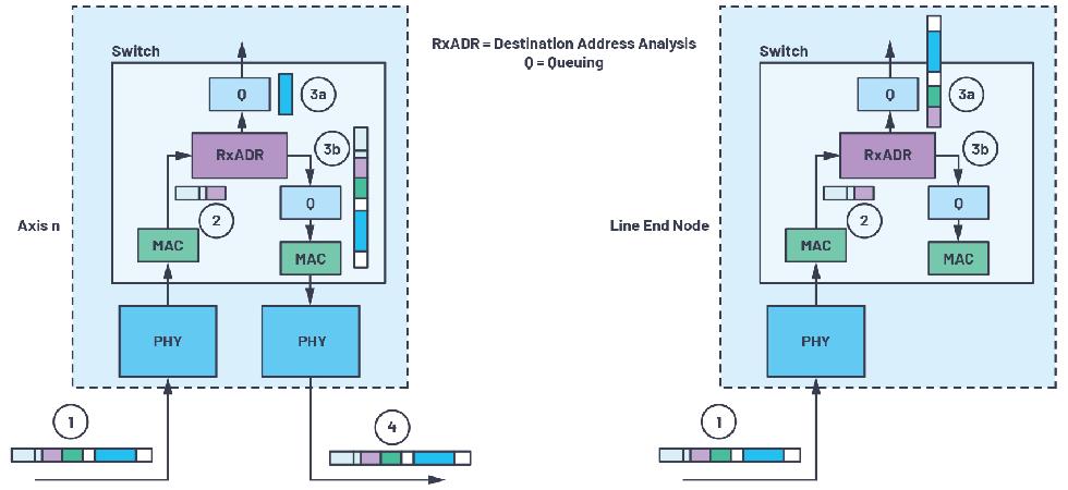 除了帶寬延遲外,其他延遲元素是由于以太網(wǎng)幀通過每個(gè)伺服網(wǎng)絡(luò)接口的PHY和雙端口開關(guān)產(chǎn)生的。這些延遲如圖4和圖5所示,其中顯示幀移動(dòng)的部分是穿過PHY進(jìn)入MAC(1-2),通過目標(biāo)地址分析時(shí),只需要對(duì)幀的前導(dǎo)和目標(biāo)部分進(jìn)行計(jì)時(shí)管控。路徑2-3a表示對(duì)當(dāng)前節(jié)點(diǎn)有效載荷數(shù)據(jù)的截取,路徑2-3b則表示幀向目標(biāo)節(jié)點(diǎn)行進(jìn)的路程。圖4a只顯示傳輸給2-3a中的應(yīng)用的有效載荷,圖4b則顯示被傳輸?shù)膸拇蟛糠?;這表明以太網(wǎng)協(xié)議之間可能存在細(xì)微的差異。路徑3b-4表示幀出站傳輸,通過傳輸隊(duì)列、通過PHY,然后回到線纜。圖中所示的線路終端節(jié)點(diǎn)中不存在這種路徑。這里假設(shè)采用直通數(shù)據(jù)包交換,而不是存儲(chǔ)轉(zhuǎn)發(fā),后者的延遲時(shí)間更長(zhǎng),因?yàn)檎麄€(gè)幀都要計(jì)入開關(guān),然后再被轉(zhuǎn)發(fā)。