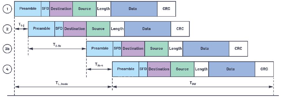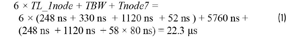 圖5按時(shí)間線顯示幀的延時(shí)元素,其中描述了幀穿過一個(gè)軸節(jié)點(diǎn)的全部傳輸時(shí)間。TBW表示帶寬延遲,TL_1node 表示幀通過單個(gè)節(jié)點(diǎn)的延遲。除了與位通過線路進(jìn)行物理傳輸,以及計(jì)入地址位用于實(shí)施目標(biāo)地址分析相關(guān)的延遲外,PHY和開關(guān)組件延遲是其他會(huì)影響系統(tǒng)內(nèi)的傳輸延遲的因素。隨著線路上的位速率增加,節(jié)點(diǎn)數(shù)量增多,這些延遲對(duì)整個(gè)端到端幀傳輸延遲的影響會(huì)更大。