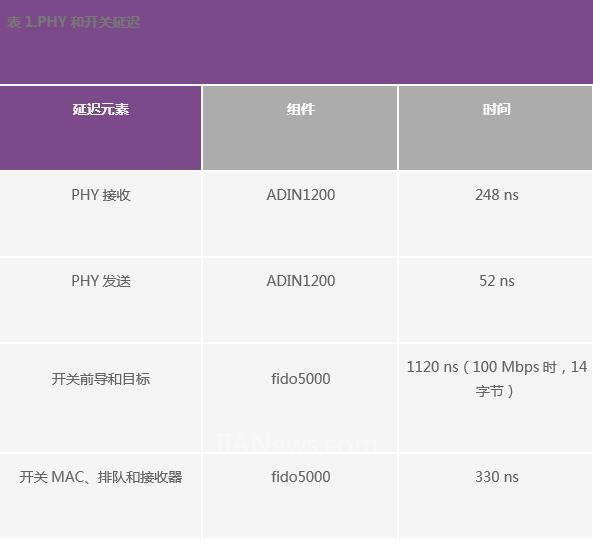 表1列出了PHY和開關(guān)導(dǎo)致的延遲,前提是假設(shè)接收緩沖器分析是以目標(biāo)地址為基礎(chǔ),且假設(shè)采用100 Mbps網(wǎng)絡(luò)。