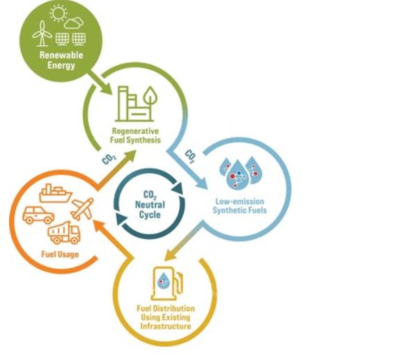 為了盡量減少排放及其對(duì)氣候的影響,最好采用由碳中性可再生能源產(chǎn)生的電力,來(lái)生產(chǎn)合成燃料。就OME和DMC而言,可以通過(guò)電解氫和來(lái)自工業(yè)廢氣或空氣中的CO2,來(lái)生產(chǎn)合成燃料,如甲醇、乙醇等。下一步是將合成氣體轉(zhuǎn)化為合成燃料。通過(guò)這種方法,創(chuàng)建CO2閉環(huán)。