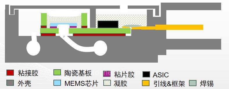 相比普通IC,MEMS壓力傳感器除了原理差異外,應(yīng)用環(huán)境也具有非常大的區(qū)別,以進(jìn)氣壓力傳感器為例,其測(cè)量的是物理量而非電學(xué)量,傳感器需要特殊封裝將變化的氣壓導(dǎo)入到MEMS敏感膜上,而汽車應(yīng)用環(huán)境決定其氣氛中帶有各種潛在的水汽及腐蝕性成分,故而需要在MEMS敏感膜上涂敷保護(hù)介質(zhì),實(shí)現(xiàn)壓力變化傳遞的同時(shí)保護(hù)敏感元件免受環(huán)境的侵蝕,同時(shí)需要保證在全溫區(qū)和全壓力量程范圍內(nèi)具有良好的精度性能及長(zhǎng)期可靠性保證。通常汽車MEMS進(jìn)氣壓力傳感器工作范圍覆蓋到-40℃~125℃,有些應(yīng)用如帶廢氣再循環(huán)EGR系統(tǒng)的發(fā)動(dòng)機(jī),其進(jìn)氣口將包含尾氣成分,會(huì)帶來(lái)更高的溫度挑戰(zhàn)及更多的化學(xué)成分如鹵素等的侵蝕挑戰(zhàn)。
