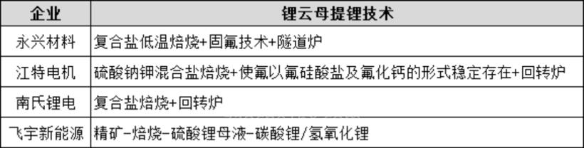 目前包括永興材料、江特電機、南氏鋰電主要采用復合鹽低溫焙燒法,飛宇新能源則是采用鋰云母礦高溫焙燒,通過制成鋰母液制備碳酸鋰。