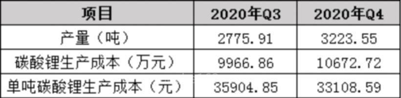 根據(jù)永興材料2020年年報顯示,2020年Q3碳酸鋰產(chǎn)線達產(chǎn)以來,至Q4碳酸鋰成本已降至3.3萬元/噸,季度產(chǎn)量提升至3223.55噸。