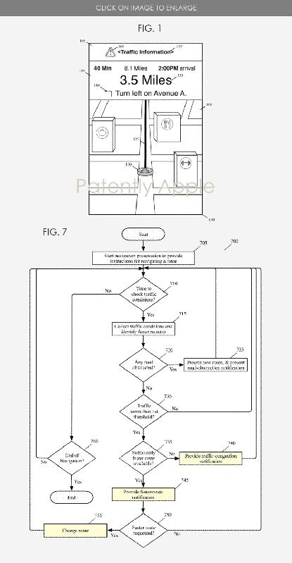 第二項泰坦項目專利名為“導(dǎo)航中的交通通知系統(tǒng)”。蘋果指出,由于智能手機(jī)等移動設(shè)備的普及,用戶可以在設(shè)備上運行各種各樣的應(yīng)用程序,其中有一種就是地圖與導(dǎo)航應(yīng)用程序,能夠讓用戶瀏覽地圖并獲得路線方向。盡管此類應(yīng)用很受歡迎,但是其功能也有缺點,給用戶帶來了不便。