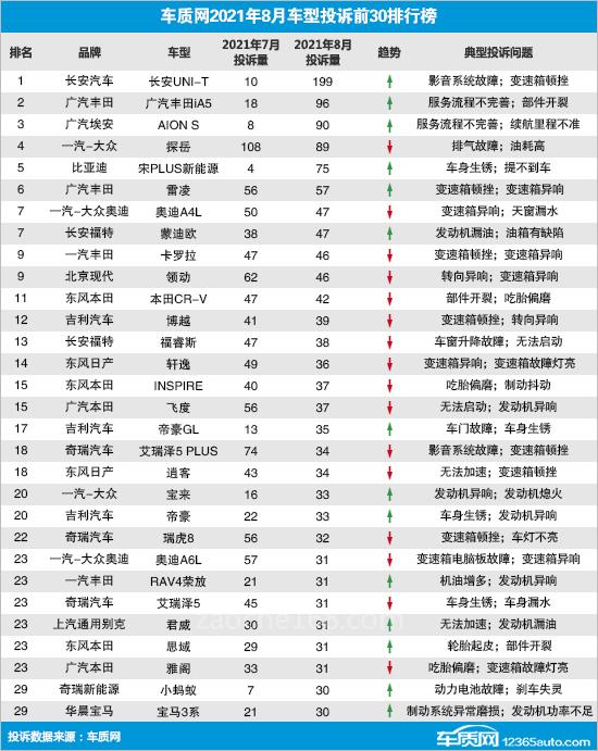 數據顯示,本月車質網受理的有效投訴信息共涉及745款車型,其中投訴達兩位數(含)以上的車型146款。此外,本月車質網共接到車企針對投訴的回復9,663條(含部分之前月份投訴的回復)。在去除投訴人因為車企解決得當而自愿申請撤訴的信息后,2021年8月投訴量前30的車系(車型)排名如下: