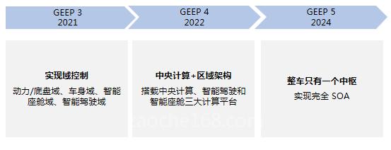 長城汽車發(fā)布了GEEP系列電子電氣架構,計劃在2021年量產(chǎn)域控制架構,劃分為4個功能域,并向集中式架構演進。