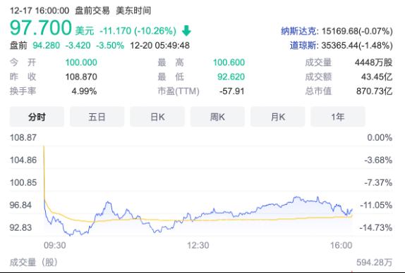 12月16日,美股盤后,被稱為“特斯拉殺手”的Rivian公布了上市后的首份財報。財報披露,公司今年第三季度,共計實現(xiàn)營收100萬美元,營業(yè)虧損7.76億美元,凈虧損12.33億美元。發(fā)布公告后,Rivian報108.87美元/股,跌5.33%,截至今日發(fā)稿,Rivian股價已跌至97.70美元。