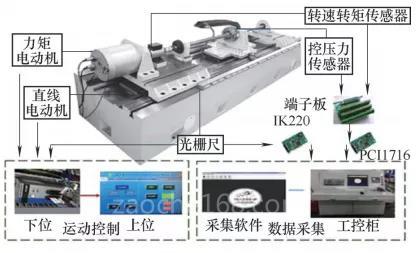 該試驗臺通過力矩電動機和直線電動機的控制器控制電動機的運動與加載,將光柵尺得到的工作臺位置及轉(zhuǎn)矩轉(zhuǎn)速傳感器測得的轉(zhuǎn)速反饋給工控機,實現(xiàn)力矩電動機和直線電動機的半閉環(huán)控制。將得到的負載、進給速度、扭矩和轉(zhuǎn)速的實時數(shù)據(jù)通過數(shù)據(jù)采集軟件來轉(zhuǎn)換成傳動效率實時值,篩選刪除加速階段和減速階段的數(shù)據(jù),將一個正行程或反行程的篩選后的傳動效率實時值取平均得到傳動效率值。