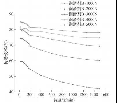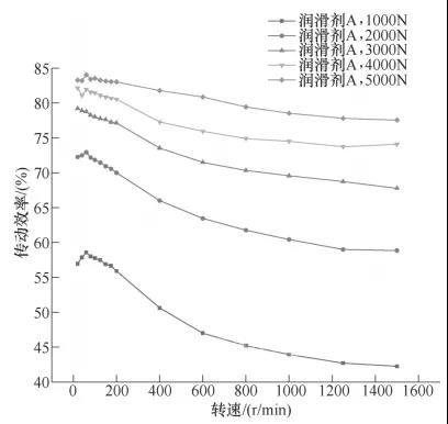 綜合分析使用潤滑脂A和潤滑脂B的試驗數(shù)據(jù)可知,隨著負載的增加,不同轉(zhuǎn)速下傳動效率的差異逐漸減??;隨著轉(zhuǎn)速的增加,不同負載下傳動效率的差異增大。