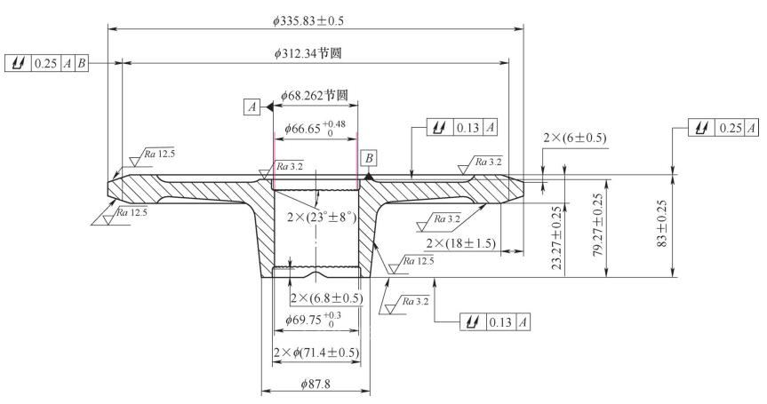 我廠前期已開發(fā)過圖1所示鏈輪的類似產(chǎn)品,加工工藝相對成熟,但前期開發(fā)產(chǎn)品的軸向圓跳動要求0.5mm,較為寬松,正常機械加工即可滿足要求,未曾發(fā)現(xiàn)軸向圓跳動超差現(xiàn)象。但該鏈輪要求齒數(shù)22,內(nèi)孔30°,平齒根漸開線花鍵齒數(shù)43,齒部端面感應(yīng)淬火,淬火硬度最小45HRC,淬硬層深度最小1.5mm;以花鍵內(nèi)孔為軸向圓跳動測量基準,要求大端齒部軸向圓跳動0.25mm、大端孔口軸向圓跳動0.13mm以及小端孔口軸向圓跳動0.13mm,軸向圓跳動較之前已開發(fā)產(chǎn)品要求相對較嚴。