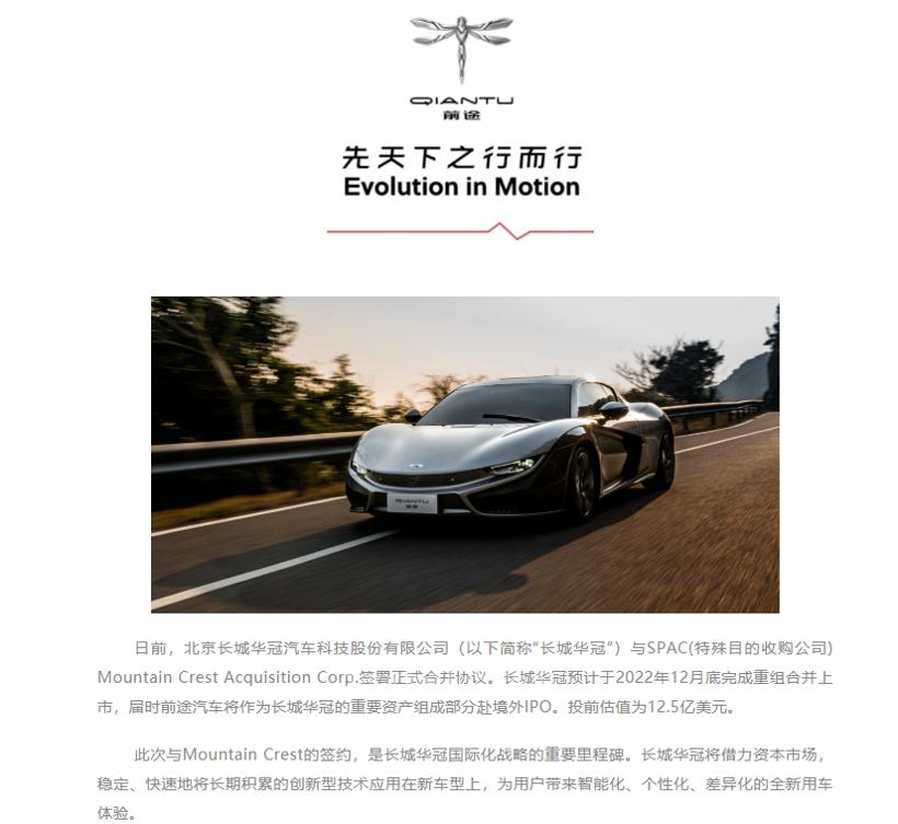 今年4月中旬,前途汽車發(fā)布了T輪融資定制版K50,并表示自2021年便啟動(dòng)了T輪融資,定向向清華校友會(huì)(陸群擁有清華大學(xué)汽車工程學(xué)士學(xué)位)開放,投資人以清華校友為主。五一小長(zhǎng)假期間,前途汽車官方公眾號(hào)發(fā)布信息稱,北京長(zhǎng)城華冠汽車科技股份有限公司(下稱“長(zhǎng)城華冠”,前途汽車的母公司)與SPAC(特殊目的收購(gòu)公司) Mountain Crest Acquisition Corp.簽署了正式合并協(xié)議,長(zhǎng)城華冠預(yù)計(jì)于2022年12月底完成重組合并上市。屆時(shí)前途汽車將作為長(zhǎng)城華冠的重要資產(chǎn)組成部分赴境外IPO,投前估值為12.5億美元。