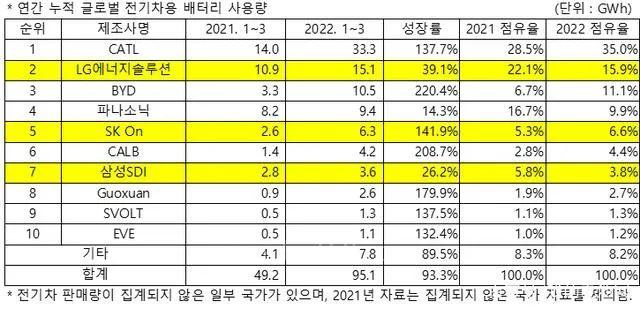 由于中國競爭對手的強勁增長,韓國主要電池制造商第一季度的市場份額同比下降6.9%,不過韓國三家電池商一季度在全球范圍內(nèi)的動力電池裝車量實現(xiàn)了兩位數(shù)的增長。