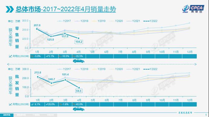 4月,因新冠疫情在國(guó)內(nèi)大面積擴(kuò)散,各地防控政策升級(jí),乘用車消費(fèi)市場(chǎng)受到較大影響。中國(guó)汽車流通協(xié)會(huì)近期發(fā)布的調(diào)查數(shù)據(jù)顯示,在調(diào)查的94個(gè)城市中,有34個(gè)城市的經(jīng)銷商有閉店現(xiàn)象,其中閉店時(shí)間在一周以上的經(jīng)銷商超過六成。此外,疫情對(duì)于消費(fèi)者出行甚至購(gòu)買力也帶來一定影響,消費(fèi)需求在一定程度上受到抑制。在此境況下,4月整體車市降幅較大,銷量達(dá)到2017年以來的同期最低值。